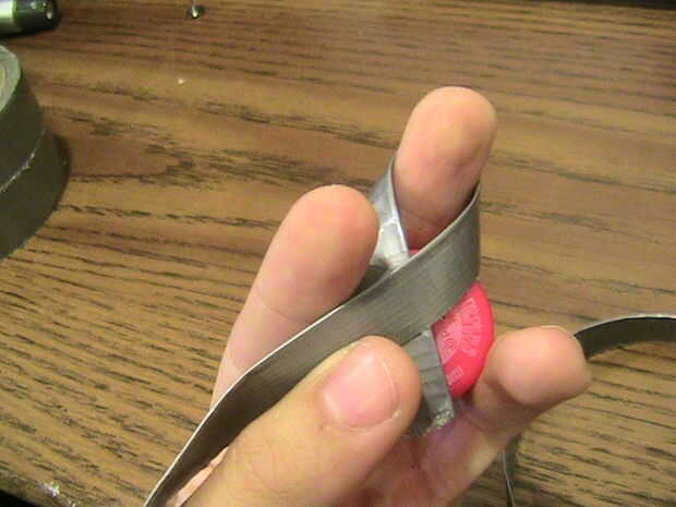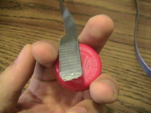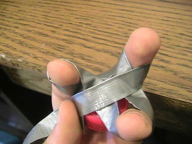 Coloque un lado de la cinta en la tapa de la botella, con el extremo del tizón en su palma.