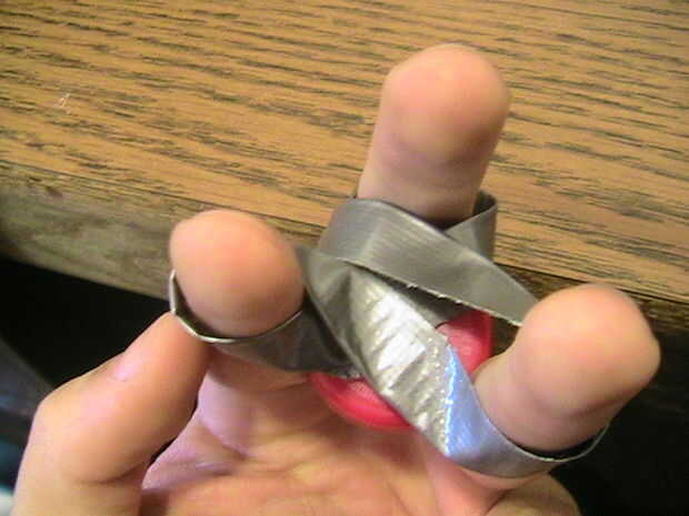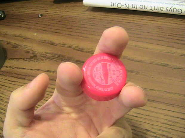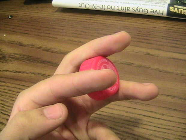 Mantenga la tapa de la botella entre los tres primeros dedos. Trate de espaciar uniformemente. La tapa de la botella está ahí para mantener los dedos separados hacia fuera. Si le falta la destreza, cualquier tres puestos funcionará como pulgar tachuelas o clavos en un tablero.