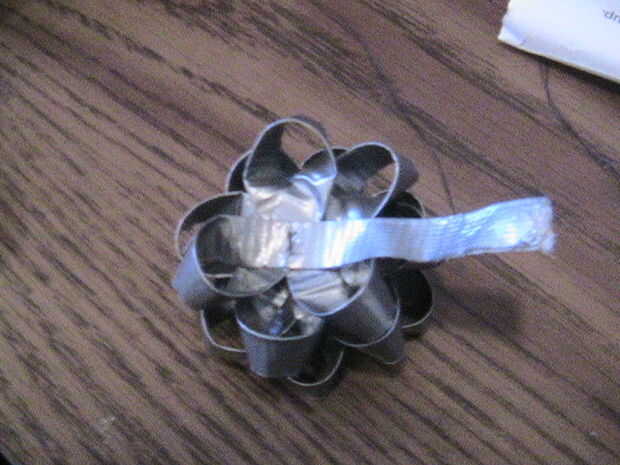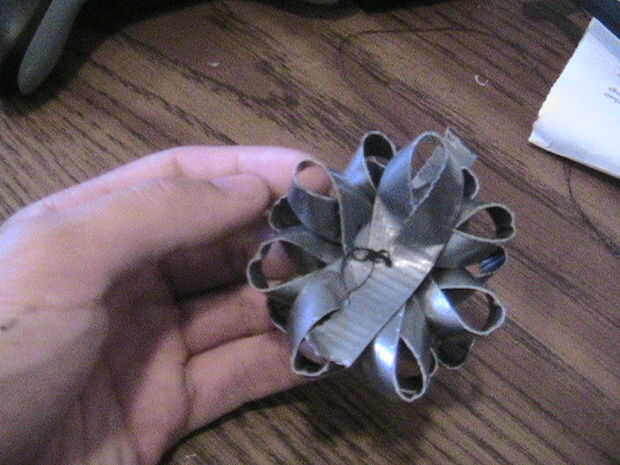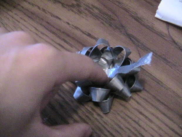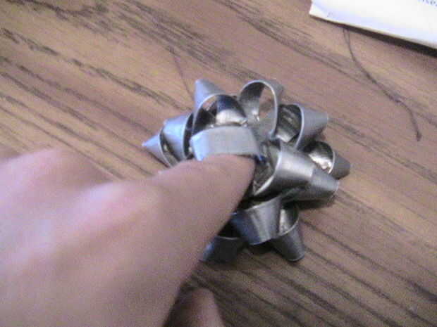 Ahora que los bucles son fijos en el centro, separar cada capa de la cinta hacia fuera de uno al otro. Ahora puedes ver claramente de cada agrupación de tres. Gire cada nivel alrededor, girarlos para encajar en los huecos en la última. Esto si dejo un patrón radial de la estrella. Voltee todo el asunto. Debe haber un sobrante de cinta que sobresale desde el centro. En lazo y cinta hacia abajo.