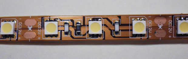 Ajustado a la caída de tensión directa de los LEDs que hay normalmente 3 LEDs en serie con un resistor limitador de corriente de la serie, cada uno de estos grupos entonces conectado en paralelo a la tensión de alimentación carriles a lo largo de la cinta. La cinta también se puede cortar entre estos grupos de 3 LEDs para satisfacer sus necesidades muy.