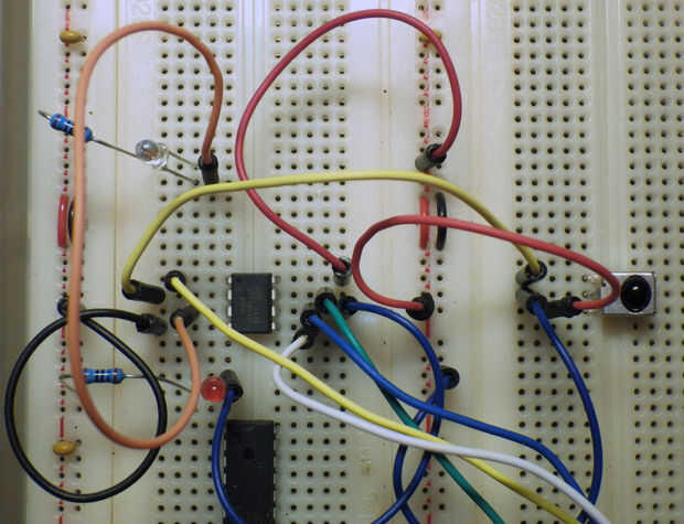 Un receptor estándar para mandos a distancia infrarrojos se une además a PB3 el ATtiny. Me encontré con una agradable biblioteca de control remoto IR, IRMP, que soporta una amplia variedad de controles remotos. Desde que tuve un control para otra cinta de LED de un distribuidor chino, opté por usar el on/off y dim-códigos de este control, pero usted pueden elegir cualquier control remoto tienes.