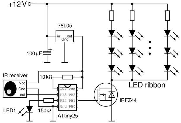 Pero tuve que añadir algo más a mi tira de la luz. Yo quería ser capaz de atenuarlo y si es posible desde un control remoto infrarrojo. Regulación se realiza mediante modulación por ancho de pulso (PWM) de un microcontrolador Atmel ATtiny25 (no estoy utilizando Arduino, pero sólo los controladores directamente). La señal PWM directamente unidades de la puerta de una MOSFET, que controla la corriente a través de la cinta LED cambiando el lado de tierra de la cinta de LED de la energía. Con el fin de evitar cualquier parpadeo el PWM frecuencia debe elegirse suficientemente alto.