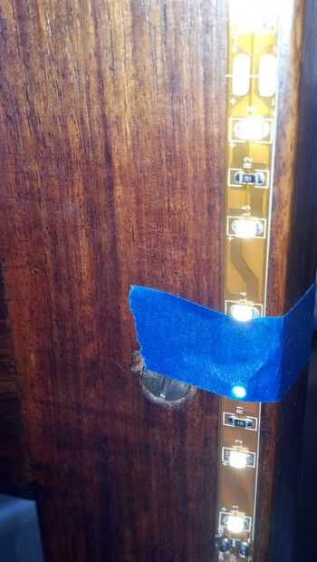La longitud restante del LED de la cinta era más que tiempo suficiente para hacer el otro lado de la puerta. Como he mencionado anteriormente, uno de los extremos de la cinta sin cortar tiene una conexión de energía, pero el otro extremo tiene dos alambres soldados previamente en. Corrí a la otra mitad de la cinta LED abajo al otro lado de la puerta (más cinta azul) con los alambres previamente soldados en la parte inferior, ya que tenía la intención de usar esos cables para alimentar la segunda cinta.
