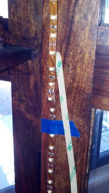 Pegar la cinta de LED abajo no es difícil, pero que desea mantener bajo tensión muy leve como vas para que no te arrugas o las ondas en él. Gravedad ayuda con esto, así que me puse a pelar el forro del adhesivo de 3 M en la parte superior y mi camino hacia abajo, quitando la cinta azul como fui. Firme abajo con los dedos al final.