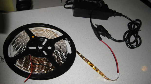 Escogí la versión en blanco cálida, como las luces de la guirnalda artificial blanco como la nieve brillante. Como la faja utiliza 12 voltios y consume 24 vatios, también compré la correspondiente unidad de alimentación por $9,25. Estos precios incluyen envío.