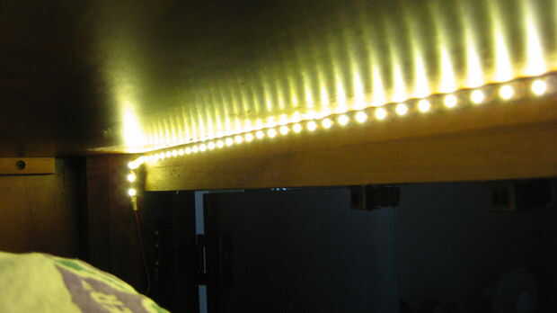 tomé el proyecto LED, dejando el interruptor magnético.  Pulse montado la cinta flexible contra el borde superior del tórax por lo que señalaron hacia la parte posterior.  Desde la segunda bandeja no tiene ningún labio, tuve que presiona la cinta contra la parte inferior delantera de la segunda plataforma.  La cinta es muy apretada.  El puente desde el módulo de potencia permite un alambre que se cortará y fue conectado fácilmente con el interruptor magnético ya montado.
