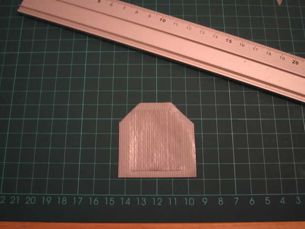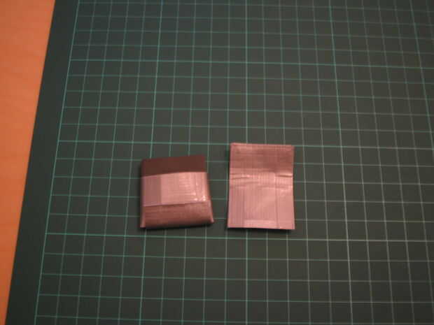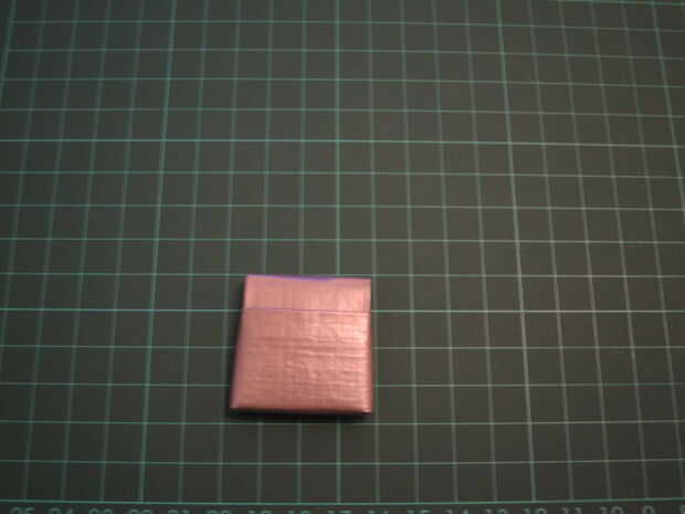 Ahora pega el pedazo más pequeño a uno con las esquinas recortadas, palillo de lado a lado pegajoso. El pedazo más pequeño será en el centro de la pieza más grande (primer cuadro). Las esquinas cortadas no serán alineado exactamente, así que con su cuchillo, recortar las esquinas así que cumplen con los puntos de la esquina de la pieza más pequeña, como en la segunda foto. Luego doblar los bordes por lo que no hay pegajosos lados mostrando. Ahora tenemos una aleta! (Segunda imagen)
