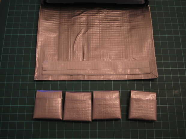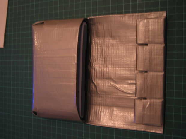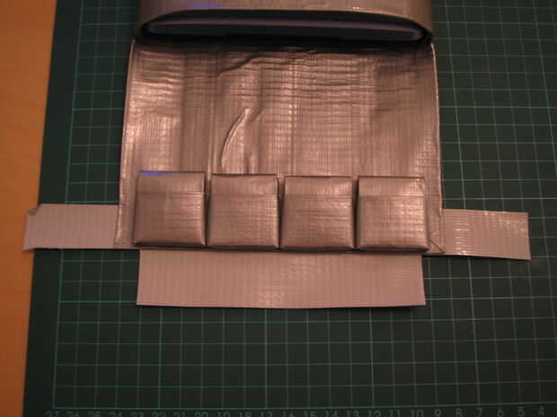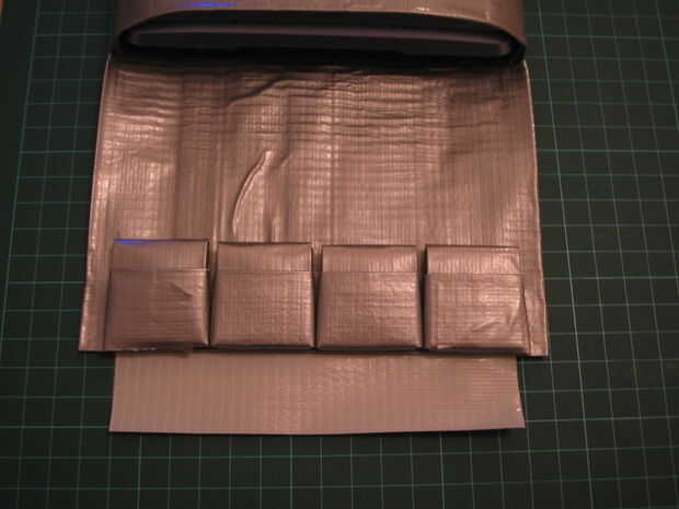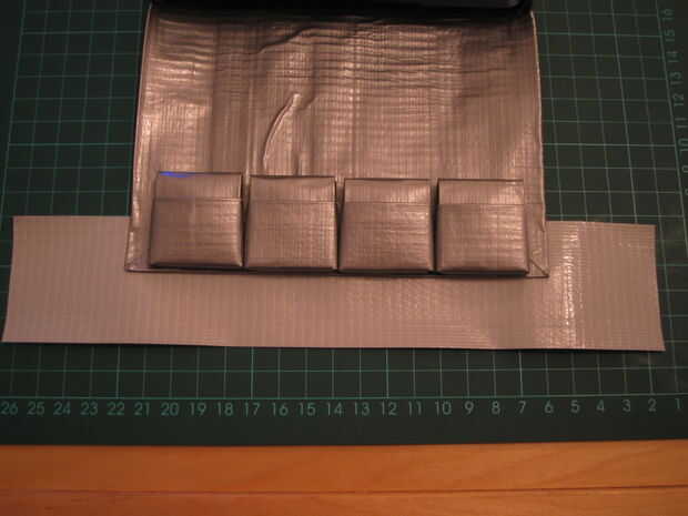 Se pegan todos los juego cuatro titulares a esta franja, la parte inferior de los soportes juego alineadas con el extremo de la aleta y descarga todo junto sin espacios, como en la segunda foto. Luego, pegue un pedazo de cinta del pato en la parte inferior de la solapa superior, con alrededor de 4cm de extra al final y cerca de la mitad de la anchura más allá del extremo de la aleta superior.