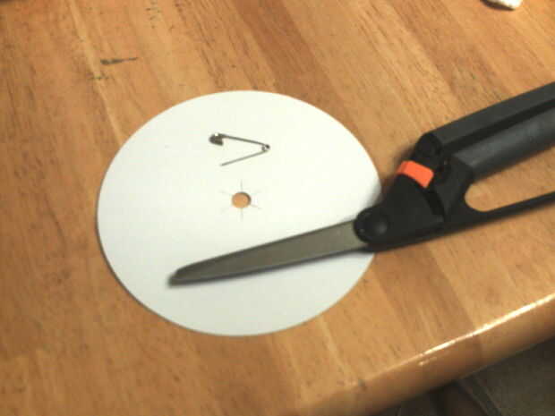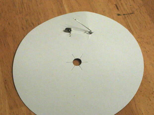 Haga dos agujeros pequeños hacia la parte superior del círculo. Coloque el extremo de la hebilla de un pin de seguridad a través de la espalda y hacer que viene hacia el otro lado.