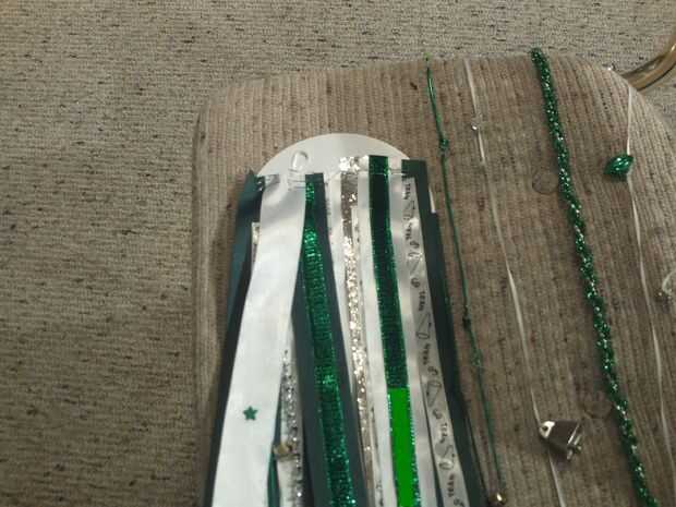 Sólo tengo una foto de este que resultó y tuvo que volver a hacerlo. Engrape las cintas de más de 1/2 camino la tarjeta. TODAS las cintas deben estar debajo del orificio central.