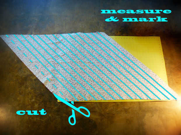 A partir de un borde en ángulo, utilizando su marcador lavable, marca tiras más ancho que ancho acabado deseado para cinta de 1-3/4 a 2 x o 3-1/2 a 4 x más amplio para la cinta de doble pliegue.