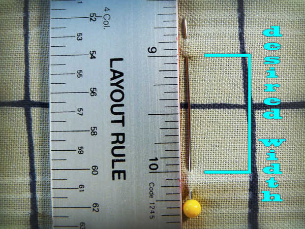 Mida el ancho deseado de su cinta y pasador de ejecución a través de la tapa de tabla de planchar, cruzado el ancho deseado y alfiler a través de la cubierta. Su pin debe estar en ángulo recto con respecto a la longitud de la tabla de planchado.