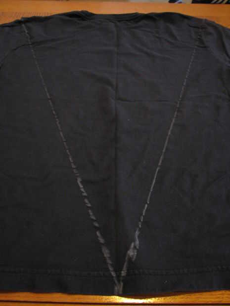 Poner la manga corta camiseta en una superficie de trabajo, suavizar cualquier las arrugas que pueda tener. Utilizando una regla y lápiz, marca de la parte superior de la camiseta en cada hombro en la parte inferior del centro de la camiseta. Usted estará haciendo una "V".