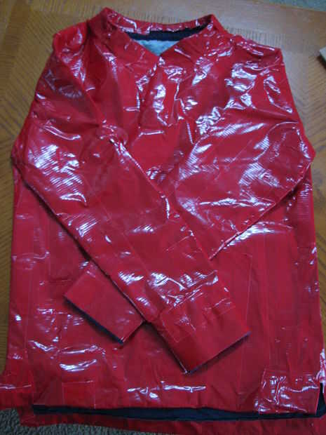 Ahora usando la camisa de manga larga, cubierta de la camisa toda con cinta pato rojo. Usar pedazos cortos de la cinta por lo que fácilmente manuvering.