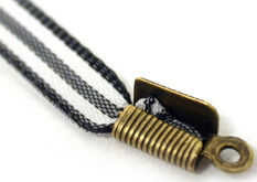 Corte a la longitud de la cinta y haga un pequeño nudo en cada extremo. Colocar una pequeña gota de pegamento dentro de uno de la tapa sobre los extremos y el nudo de cinta encima de la cola como se muestra. Usando sus alicates de cadena pliegan las aletas una a la vez para sellar el extremo de la cinta. Repita con el otro extremo anudado. Colocar un pequeño punto de pegamento dentro del bisel y coloque el botón en el bisel. Set bisel a un lado para secar.