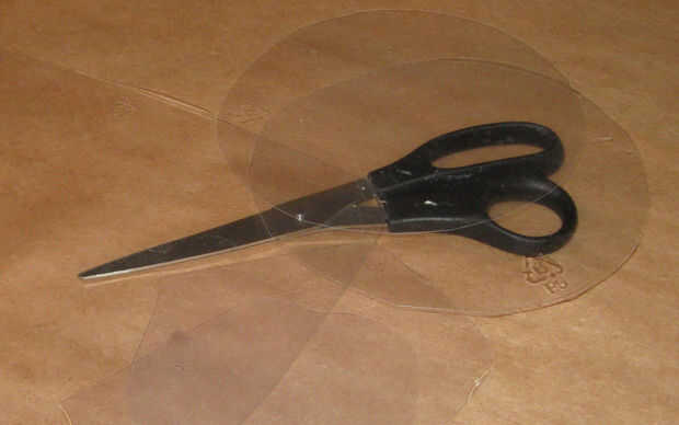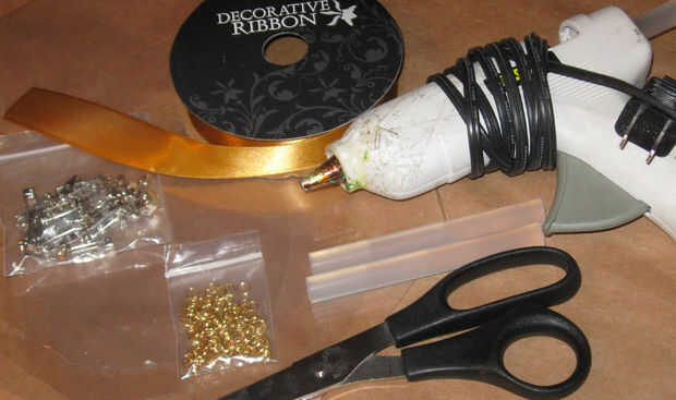 Aquí verás 1" 1/4" anillos de la joyería (dos por cinta), 1" cinta ancha, espalda pin, pistola de pegamento caliente, no te olvides de comprobar tu fuente de palillos del pegamento, tijeras, plástico transparente (más sobre esto más adelante). No mostrado: galletas, pintura en aerosol (opcional), solo sacador de agujero, alicates de punta, regla y una pluma Sharpie.