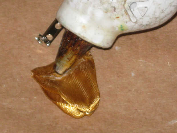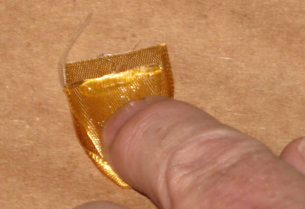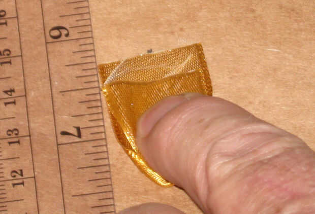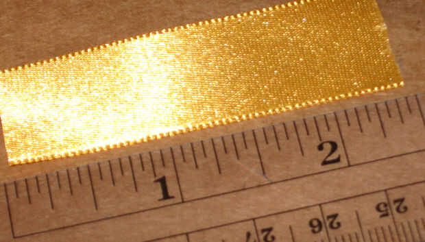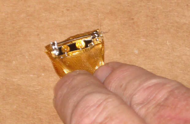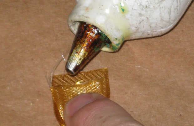 Aplanar la cinta y doble el lado corto hasta dentro de 1/4" de la parte superior del lado largo. Una gota de pegamento caliente se mantenga esto en su lugar e impedir que el frente tirando mientras cuelga. Entonces una gota del pegamento para doblar la solapa de 1/4 hacia abajo dando un top limpio agradable a la cinta. Otra gota de pegamento en la parte superior la aleta doblada será la sede para el pin-back. Pueden orientar el pin para diestros o zurdos. Soy un rightie tengo la bisagra a la derecha y cierre a la izquierda.