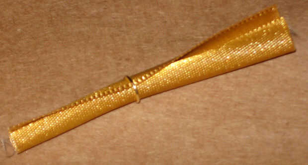 Cortar la cinta de 2 1/2" de largo. Bien, es un poco corto en la foto. A trabajar bien. Rodillo de la cinta a lo largo e inserte a través de un anillo no parando bastante medio.