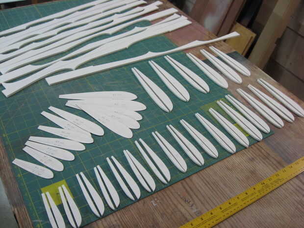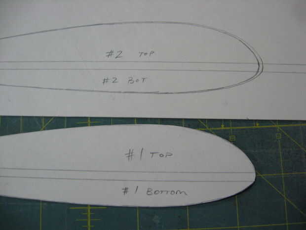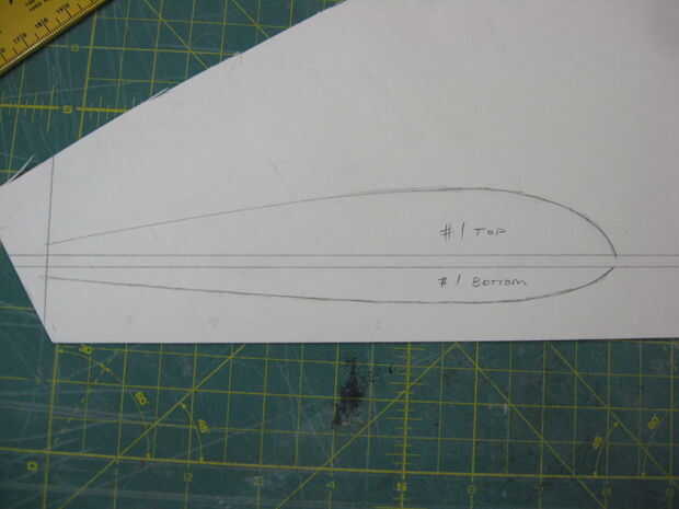 Hice doce formas aerodinámicas únicas que fueron utilizados como patrones para trazar y cortar desde el núcleo de espuma de las secciones superior e inferior de cada ala costilla. Todos los cortes se hicieron con una cuchilla exacto.