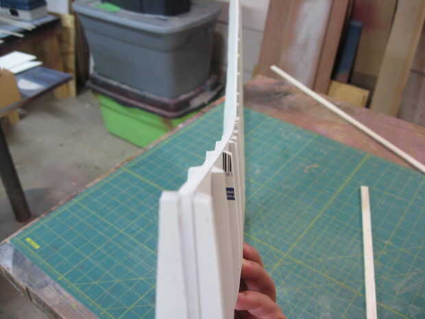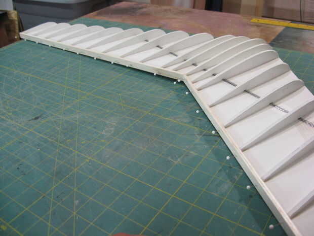 El borde de salida necesita una superficie plana donde pude conectar los timones (que son las aletas de dirección en un ala voladora, una combinación de elevador y alerones). He añadido las tiras de balsa para este fin, que también sirve para enderezar una urdimbre poco en cada lado del ala.