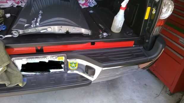 Mayoría de los carros tendrá un agujero para la elevación de la rueda de repuesto y algunos carros tendrá cámaras traseras. I cubrir estos agujeros con la cinta y luego corte los orificios con un cuchillo del exacto. Para agujeros cuadrados, hago un corte en forma de X y luego empuje la cinta extra en el orificio.