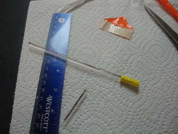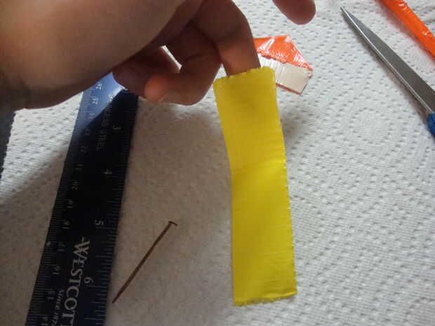 a continuación, todo lo que tienes que hacer es cortar una paja. Corté mis cerca de 5 pulgadas. Puede cortar más corto, o dejarlo en la misma longitud. Todo depende de ti. Después de cortar la paja, vas a cortar un trozo largo de cinta de pato por la mitad. Luego Envuélvala alrededor de la parte superior de la la paja.