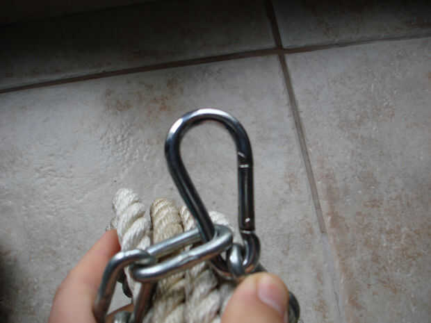 A continuación, cortar con una sierra para metales 6 anillos de la cadena para cada suspensión. Enrollarlas en un mosquetón.