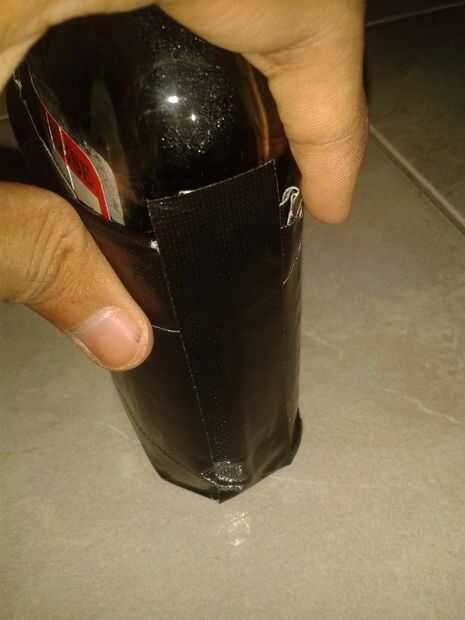 cinta aislante el interior de la bolsa para cubrir la parte pegajosa así que la botella se puede quitar sin problemas.