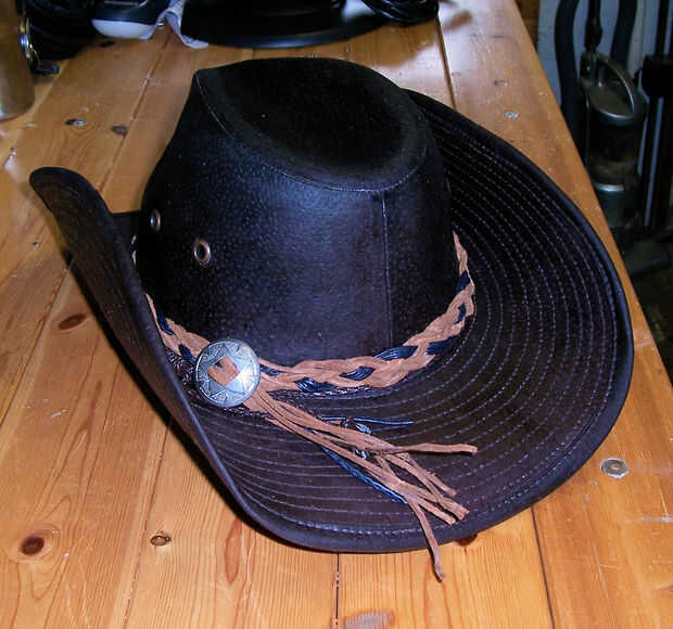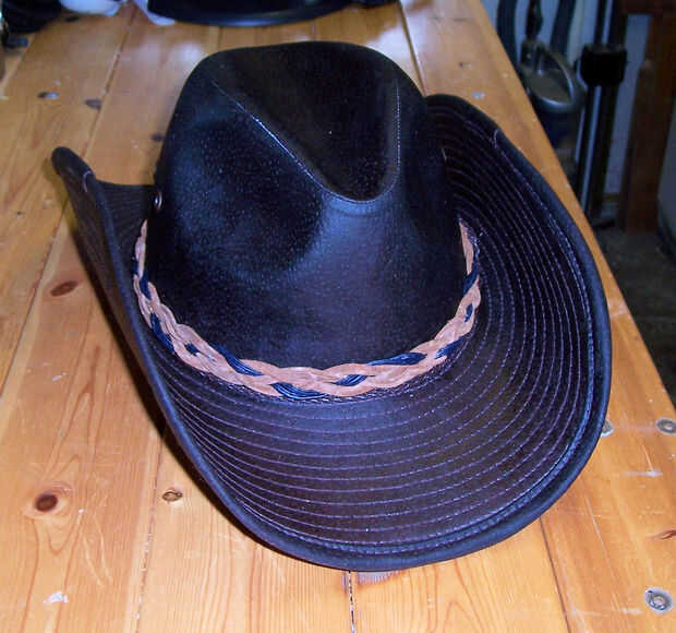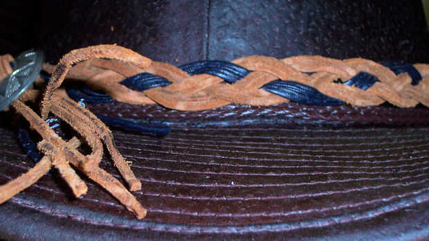 Enhebrado de los hilos a través de un viejo concho cromado & utiliza una simple trenza por todo lo alto hasta que tuve suficiente para ir que alrededor de la corona del sombrero entonces rosca las hebras por el concho dejando que los extremos sueltos de la izquierda de la parte posterior del borde.