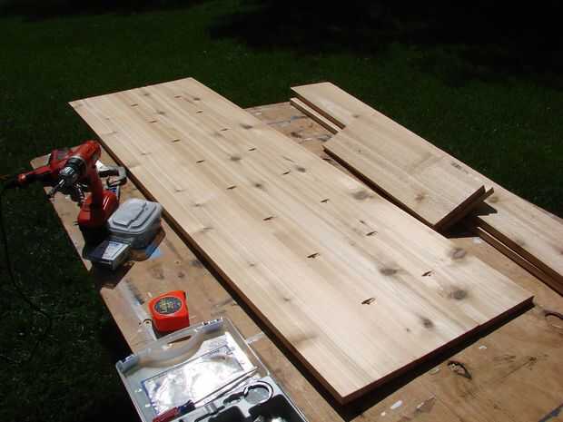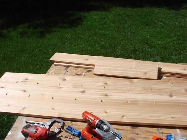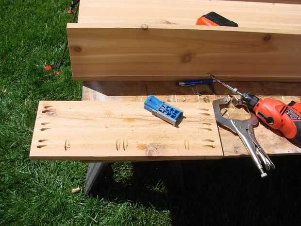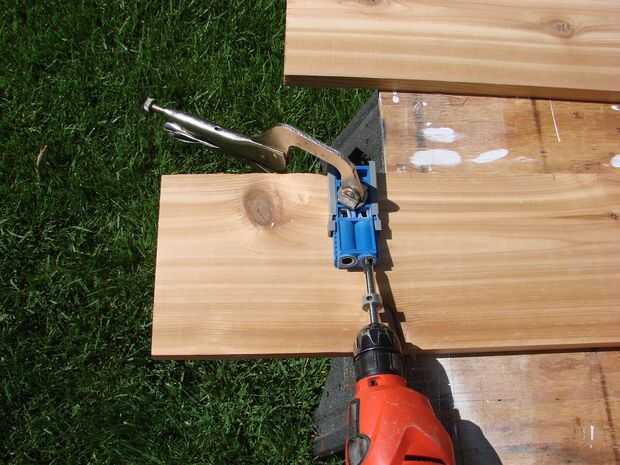 En un borde del tablero de 6 pies x 8", ajuste el Kreg Jig de 3/4" y hacer un bolsillo a intervalos de 8 pulgadas. Luego deslice un segundo tablero junto a la primera y use una abrazadera para alinear el borde izquierdo y mantener las tablas juntas. Establecer el ajuste del esfuerzo de torsión en el destornillador para evitar remover el tornillo hacia fuera. Se puede practicar en un pedazo de chatarra para obtener el par de ajuste derecho. El cedro es muy suave así que mantener el esfuerzo de torsión bajo. Tornillo en el primer exterior 1-1/4" tornillo autorroscante.