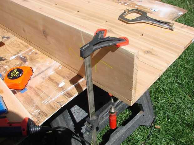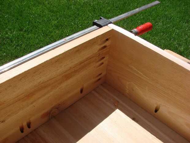La base está construida de 3 de los 8" ancho por tablas largas de 6ft. Las placas se unen mediante ocultación de agujero. Se trata de una forma rápida de hacer uniones muy fuertes.