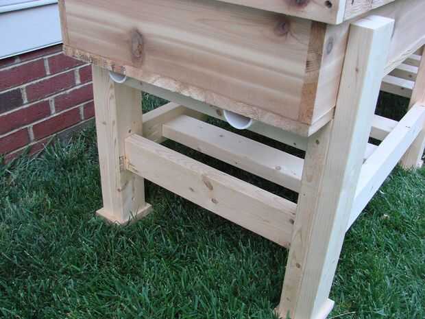 La coloración final se realizó mediante tinción de cubierta de año olímpico 6. Sólo el marco estaba manchado. La cama quedó natural para que no se contamine las verduras. Se llevó a cabo una prueba de peso - no maneja 200 libras problema. El volumen de la caja es de aproximadamente 12 pies cúbicos. La densidad del suelo húmedo de encapsulamiento es aproximadamente 50 libras / pie cúbico (fuentes web - no seguro qué tan precisas es). Esto significa que la estructura estará apoyando a 600 libras de suelo. Cada pierna por lo tanto, apoyará a 100 libras.