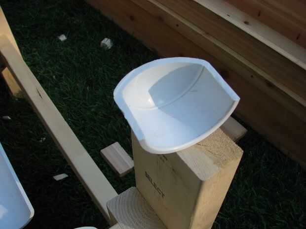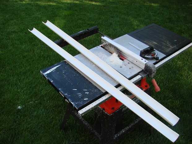 Para capturar el desbordamiento de los agujeros de drenaje, las vigas transversales del marco fueron recortadas para aceptar una mitad de un tubo de PVC de 2". El tubo de PVC se cortó con una sierra de mesa. Por favor tenga mucho cuidado al hacerlo y usar una vara para empujar para que los dedos están muy lejos de la hoja en todo momento. Un casquillo de la pipa fue también cortar en 2 y pegado a los extremos para desbordamiento siempre corre de un extremo (dentro de lo... instalar con una ligera inclinación hacia el lado que desea drenar hacia fuera de)