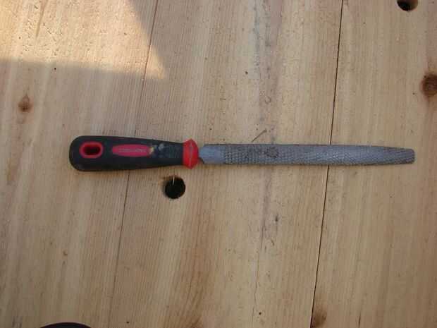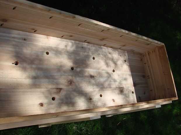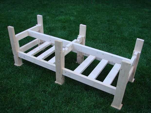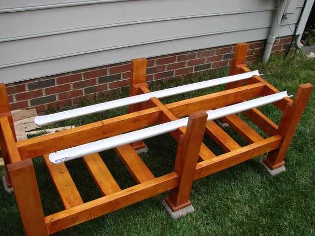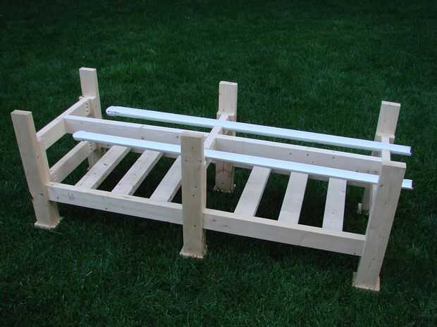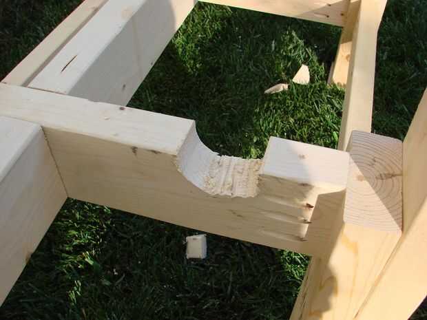 Las muescas se dibujaron sobre la Cruz vigas usando el extremo del tubo PVC raja como una plantilla y, a continuación, una guía de la Sierra fue utilizado para cortar las muescas. Los cortes se suavizan con una escofina y luego un archivo. El tubo de PVC de hendidura se encuentra ligeramente por debajo de la superficie para que haya un pequeño boquete de aire entre la parte inferior de la cama y el tubo de PVC. Esto debería ayudar a cosas permanecer seco y evitar el crecimiento de moho.