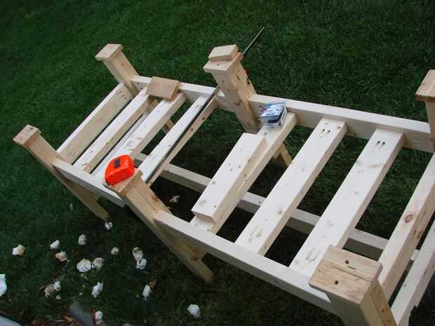 El estante consta de 3 piezas de 2 x 4 que se atornillan a los rieles inferiores a cada lado. Las piezas del estante son 20-1/2" de largo. Su medida puede variar si los rieles están no exactamente centrados con respecto a las piernas. Medir su longitud real y la corte en consecuencia. Esta forma de trabajo le permite hacer ajustes a medida que avanza. Si se corta la madera en el frente, tienes que tener mucho cuidado para conseguir todo lo exactamente correcto. Corte un poco más adelante, le permite corregir imperfecciones inevitables - esto es después de todo hecho a mano.