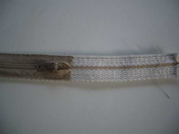 Comience por colocar la cremallera cerrada, cara arriba, en la parte posterior de la cinta con el tirón de la 4½"(11cm) desde el extremo donde van los anillos en D. Si la cremallera es más estrecha que la cinta, entonces posición centralizada (es decir por lo que no existe una frontera incluso de las correas a lo largo de ambos bordes) y pin, luego virar alrededor de los cuatro bordes. Como pin en su lugar, la curva un poco el combo de las correas-zip en la forma que va a ser cuando es gastado, es decir con la cremallera en el interior de la curva. Para un rar que es el mismo ancho que la cinta, un borde largo posición justo en el borde de la cinta, la clavija y virar de borde (otra vez, con un poco de curva). Entonces virar del otro canto largo también justo dentro del borde de la cinta – esto hará que el bombeo de zip siempre tan levemente, que está muy bien, proporciona un poco más espacio en el bolsillo oculto. Finalmente, virar los bordes superior e inferior de la cremallera en su lugar también.
