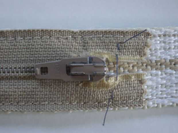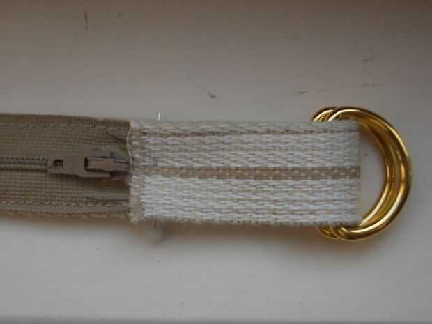Cerrar la cremallera y el extremo superior de la misma en lugar de la tachuela. Deslice los anillos en D en el extremo neatened de la cinta y pliegan en el interior con el extremo derecho contra el tirón de la cremallera. Al final en lugar de la tachuela, luego abrir el zip para obtener el tirón de la cremallera de. La necesidad de anillas que estorben demasiado, así que guárdelos la cerca del extremo doblado encima. En el lado derecho, coser todo a través de ambas capas de cinta cerca del extremo neatened, pivote en el borde de la cinta, hacer un paralelo de puntada con el borde y luego gire otra vez y puntada hacia atrás para hacer dos filas cercanas, paralelas de puntadas.