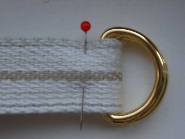 Coloque los anillos en D como se muestra en las fotos, con el menor (viéndolo desde el lado derecho en el pliegue) y el superior sobre ella, pero un poco más lejos de la tapa, de modo que los dos lados rectos de los anillos se encuentran lado a lado. Clave a través de ambas capas de correas para sujetar los anillos en su lugar. La viradas deben ser lo más cerca posible al anillo superior. Ahora Pespuntear sobre el tacking - necesitarás usar el prensatelas para obtener las puntadas de derecha contra el aro. Una vez más, del pivote al final, hacer una puntada (dar vuelta la máquina sobre utilizando el volante de dirección es mejor, porque los anillos detendrá el pie va totalmente hacia abajo), gire hacia atrás y coser una fila paralela de costura en reversa. (Usted encontrará que usted no puede coser la segunda fila en la dirección de avance).
