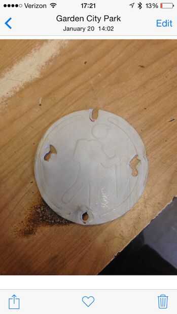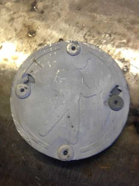 Para hacer la hebilla maciza, una parte posterior tendrá que cortarse. I utiliza un cortador de plasma para cortar un círculo y luego lo completa con una amoladora. Luego, perforar los agujeros en la chapa y utiliza remaches para conectar la pistola al disco de metal. Los remaches fueron necesarios porque el marcador de la pista era demasiado fino para soldar y sólo habría derretido antes de la chapa incluso tuvo la oportunidad de calentar. Después de que el marcador del rastro fue clavado a la base del metal de hoja, suelo al ras y con chorro de arena toda la cosa. (Alambre Wheeling es un sustituto del formidable, pero con chorro de arena es más fácil y tiene un efecto ligeramente diferente).
