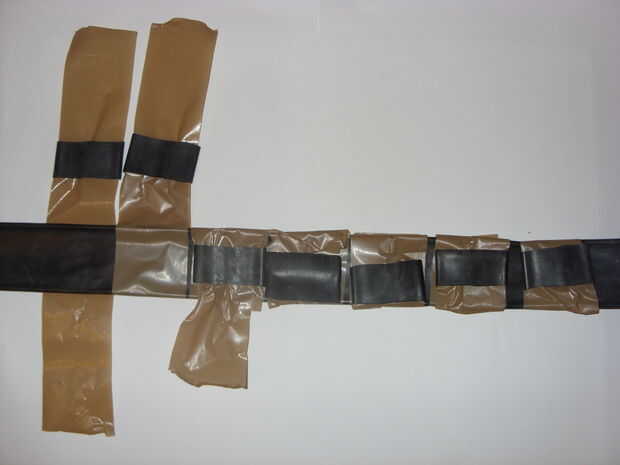 Fuerte como cuero y sólo me costó el precio de un rollo de cinta adhesiva, una hebilla antigua y un par de horas.Materiales:1 rollo de cinta adhesiva.hebilla de 1 correapieza 1 13 pulg x 7 pulg. del tablero de tarjetapiezas 2 13 pulg x 5 pulg. del ta