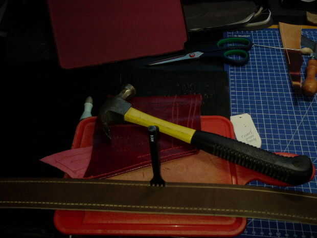 Primero dibuje una línea con mi ranurador. Luego tengo un dispositivo especial llamado cuero puncer o cincel para 4 agujeros - usted puede ver en la imagen. Hice los agujeros con mi golpe.