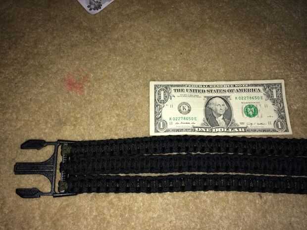 Hice 3 trenzas planas iguales de 150' de paracord 550 unida a una hebilla grande paracaídas. el dólar está en las fotos para tener una comparación de tamaño.
