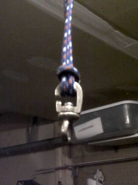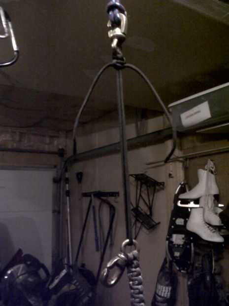 -Suspender uno de los clips de Inglefield de un objeto estacionario, como un perno de anillo o viga de techo.