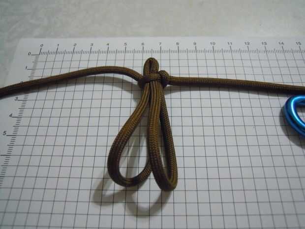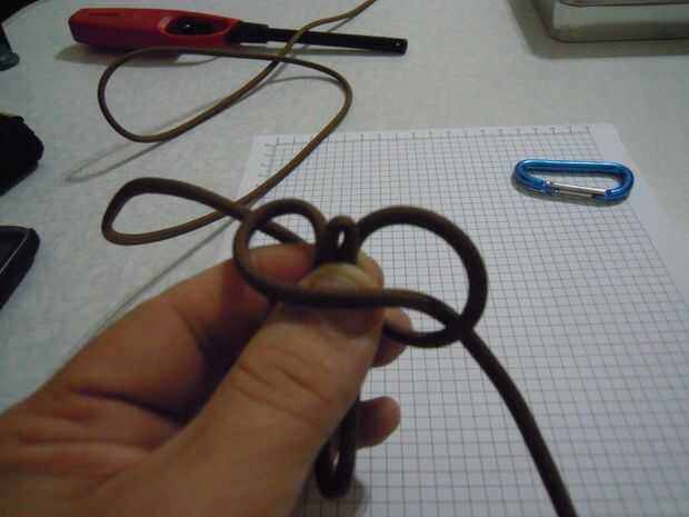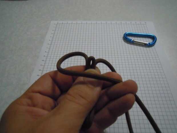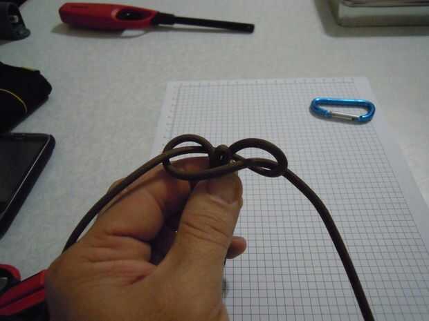 Ahora Enrosque el filamento de la mano derecha de la parte posterior a través del bucle formado por el filamento de la mano izquierda. (sexta foto)