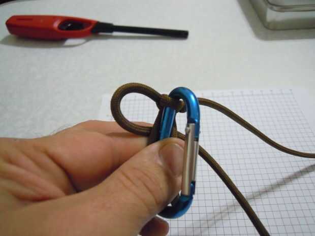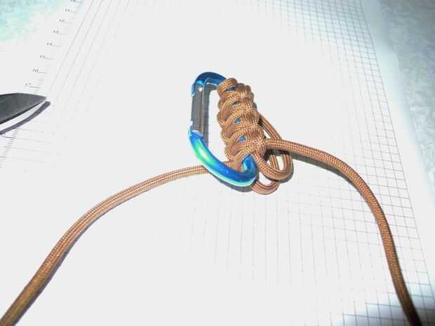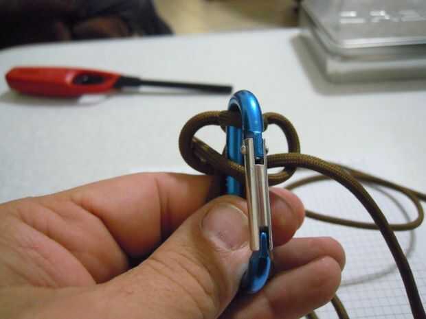 Tomar la hebra de la derecha y desde la parte superior hacia atrás detrás de la hebra de la izquierda y luego traer al frente, más allá de la pata trasera de la pinza. En el lado izquierdo debe ir a través del bucle formado por el filamento de la mano izquierda. (foto 4) Apriételo.