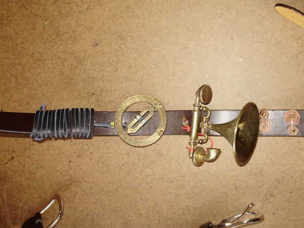 El reloj de sol se basa en un diseño alemán medieval y se puede utilizar en todas las latitudes norte sub-árticas. La campana del teléfono es para convocar ayuda, por supuesto. Planeo hacer unas bolsas para objetos pequeños y moneda.