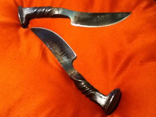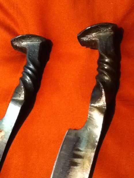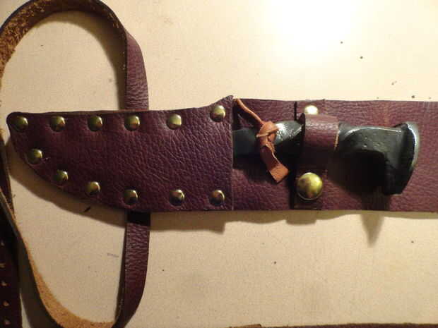 Me dieron la asignación para hacer fundas de cinturón con correas de los muslos para cuchillos de encargo. El cliente pidió que los artículos queden en sus puntos dados permaneciendo evaluables para escalada y senderismo. Los elementos se formaron a partir de objetos encontrados (lazos de ferrocarril) que fueron enviados a un herrero a la forma.