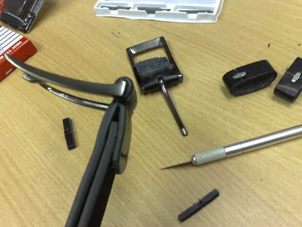 Ahora es el momento para recortar y meter los cinturones, para iniciar la línea de los cinturones y una de las hebillas de corte que puede sentarse cómodamente en el cinturón de otros y de modo que los orificios en el otro terminan línea, he utilizado pegamento caliente para fijar las dos correas pero si tienes acceso a una máquina de coser muy sugiero hacerlo en su lugar.