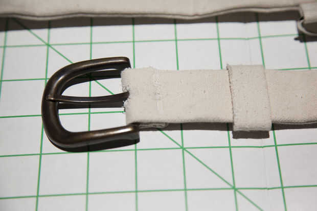 Tal vez desee hacer un guardacorrea (no estoy seguro si ese es el término correcto) al lado de la hebilla para evitar que la punta del cinturón sobresale. Corte y acabado de borde una pequeña correa de tela. Te recomiendo el acabamiento del borde sobrehilado o zig-zag cose todo el contorno; Si tratas de doblar los bordes en será demasiado gruesos. Cuando calcule la longitud de la correa, asegúrese de considerar el espesor del extremo del cinturón, que tiene que pasar por. Luego coser la tira en la correa. Para el primer extremo que puede coser a máquina, pero se debe mano-coser el segundo final.