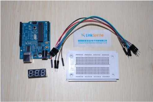 e n este experimento, que wi l l prueba digi ts 1 a 8 y auto scrol l pantalla LED de 7-seg. Los componentes utilizados en este experimento se muestran a continuación: Los componentes son un LED de 7-seg, 8 puente wi res y un protoboard. Primer paso: esquemas: